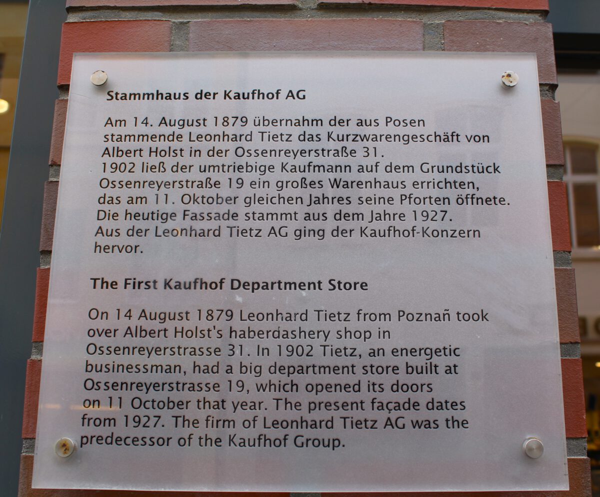The Leonhard Tietz department store originated from a small shop that Leonhard Tietz, a Jewish merchant from Birnbaum (formerly in the Province of Posen, now Poland), opened at 31 Ossenreyerstraße on August 14, 1879. Starting from Stralsund, he, his wife Flora, and other family members built Leonhard Tietz AG into one of Germany’s major department store chains. After the Tietz family was forced by the Nazis to withdraw from the company and was expropriated in 1933–34, the company was renamed Westdeutsche Kaufhof AG, later Kaufhof AG. The department store at Ossenreyerstraße 19, which opened on October 11, 1902, was built according to plans by architect Georg Falck. The current façade, in the Brick Expressionist style, dates from 1927.