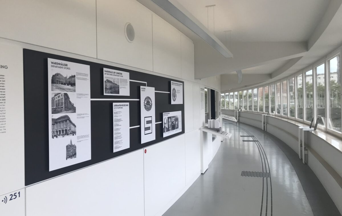 Im ehemaligen Warenhaus Schocken in Chemnitz ist nicht nur das Staatliche Museum für Archäologie untergebracht. In den Erkern des Gebäudes befinden sich über drei Etagen gleich drei Ausstellungen zum alten Warenhaus Schocken: zum Gründer Salman Schocken, zum Schockenkonzern und zu Erich Mendelsohn als Architekt der Schocken Warenhäuser. Die Ausstellung verläuft parallel zur Fensterfassade. Entlang der Fenster bietet ein Zeitstrahl mit wichtigen Lebensdaten und geschichtlichen Ereignissen in allen drei Ausstellungen eine chronologische Orientierung. Die Ausstellung ist optisch äußerst ansprechend gestaltet. Auch wenn sie text- und bildlastig ist, fühlt sich der Besucher nicht mit Informationen überfrachtet. Mit diesen Ausstellungen wird demonstriert, wie die alten Warenhäuser mit einer überschaubaren Anzahl von Exponaten eindrucksvoll dargestellt werden können. Für die Stralsunder Bestrebungen, die Warenhäuser Wertheim und Tietz angemessen als Teil der Stadtgeschichte museal zu präsentieren, sollte dies ein leuchtendes Beispiel sein.